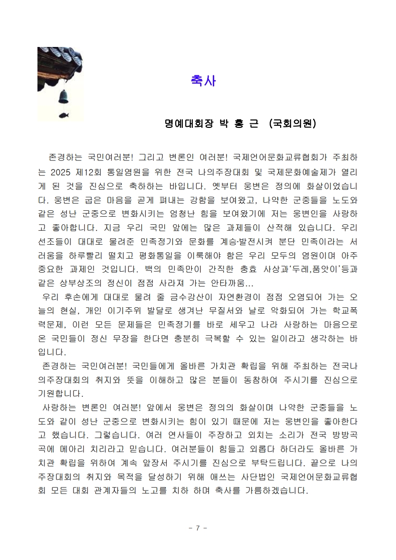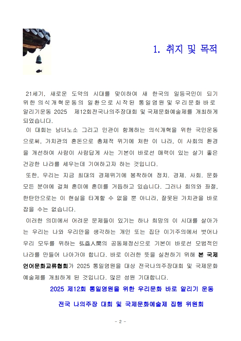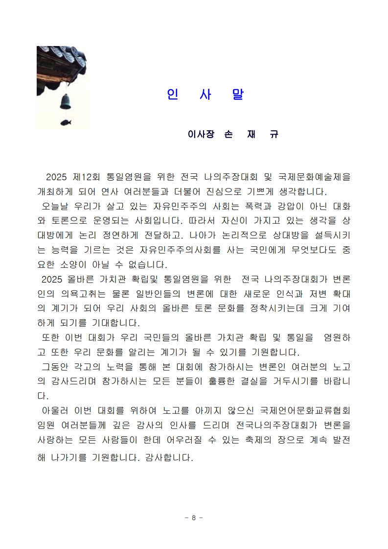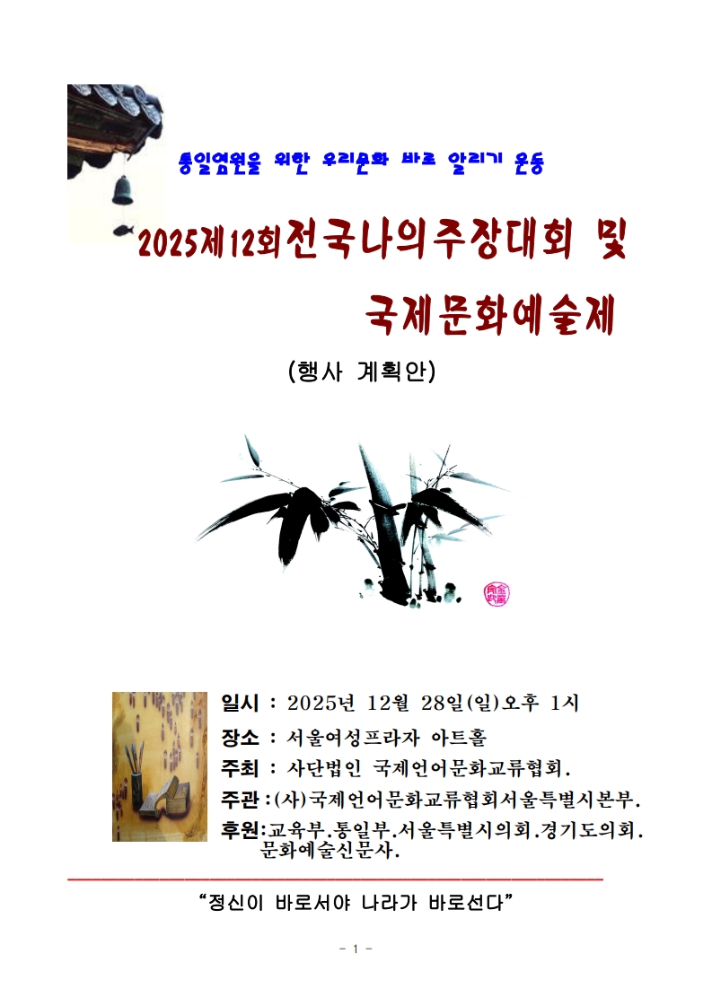홈(사)국제언어문화교류협회행사 & 대회안내 행사 & 대회안내 2025 제12회 전국나의주장 대회 및 국제문화예술제 작성자 Admin 작성일 2025-12-08 15:44 조회 30 좋아요 0 싫어요 0 인쇄 전체 0 추천순 작성순 최신순 작성자 비밀번호 사진 첨부파일 « 2024제11회전국나의주장대회 및 국제문화예술제 목록보기 Powered by KBoard