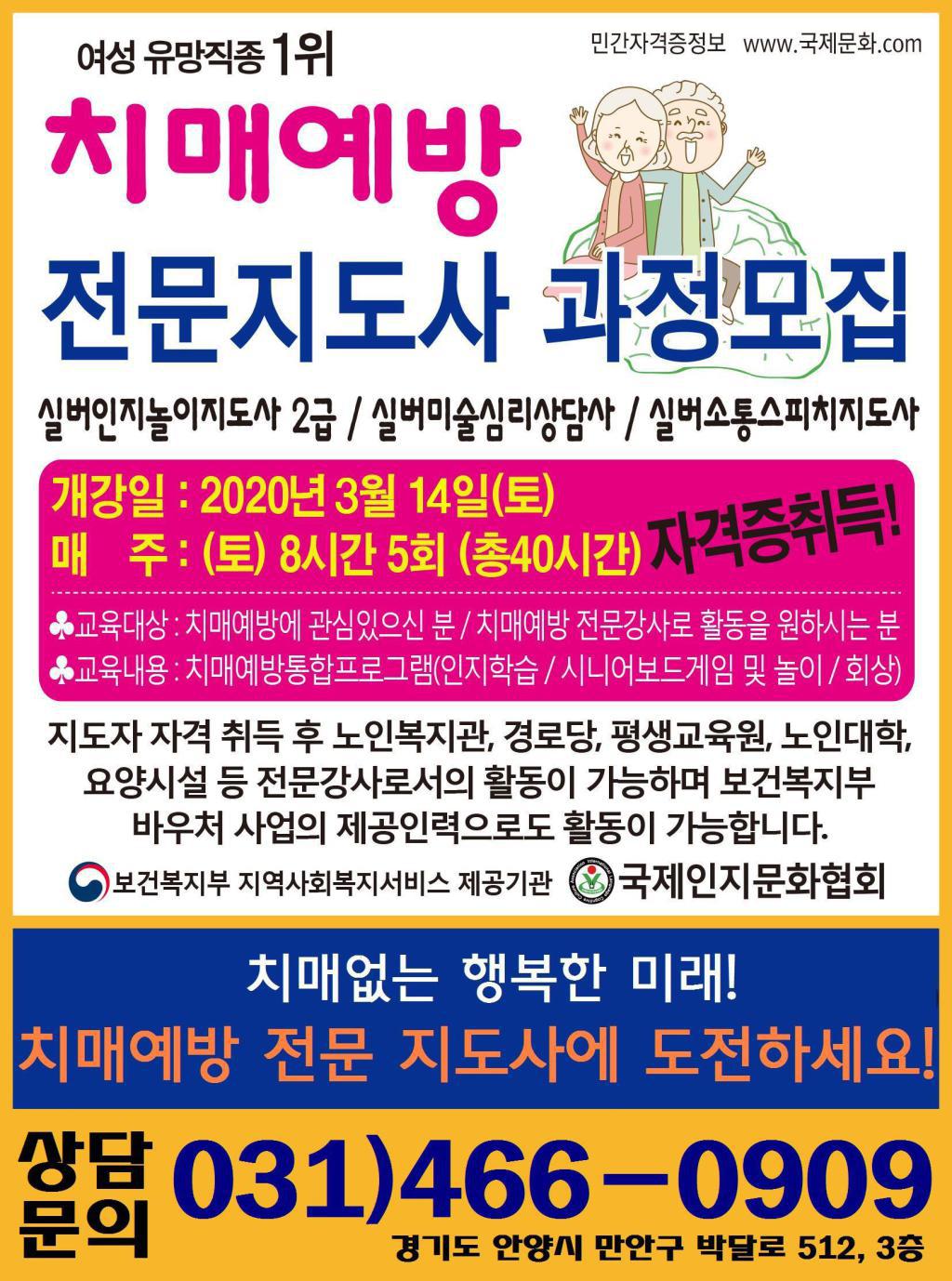 홈성남인재개발평생교육원자격교육과정교육강좌일정 교육강좌일정 ♣안양지부♣ 치매예방전문지도자 과정 작성자 관리자 작성일 2020-02-28 04:23 조회 600 교육기간 : 2020년 3월 14일(토) ~ 4월 11일(토)교육시간 : 매주 토요일 / 오전 9시 30분 ~ 오후 5시 30분선착순 20명 모집관심있으신분은 등록을 서둘러주세요^^ 좋아요 0 싫어요 0 인쇄 « ♣울산남구지부♣ 치매예방전문지도자 과정 ♣밀양지부♣ 치매예방전문지도자 과정 » 목록보기 답글쓰기 글수정 글삭제 Powered by KBoard