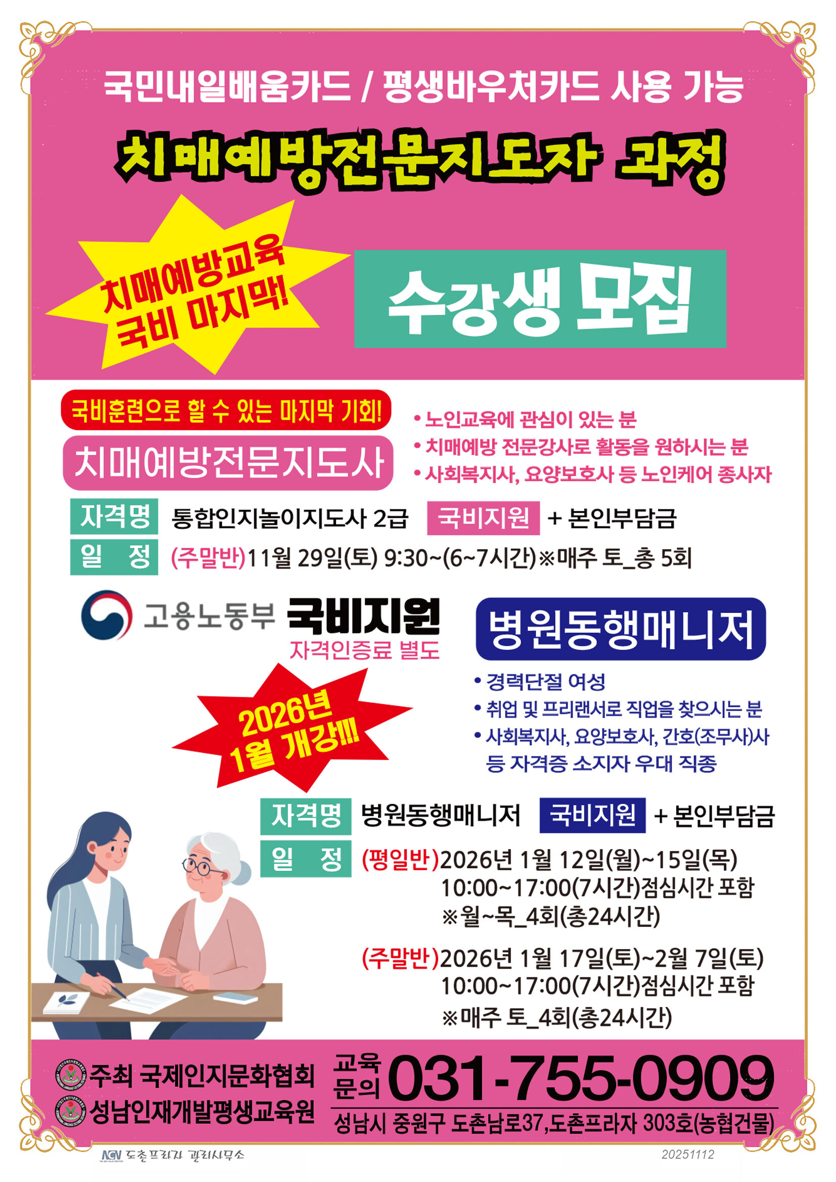 [출처] 「치매예방전문지도사」 & 「병원동행매니저」 자격과정 수강생모집|작성자 성남인재개발평생교육